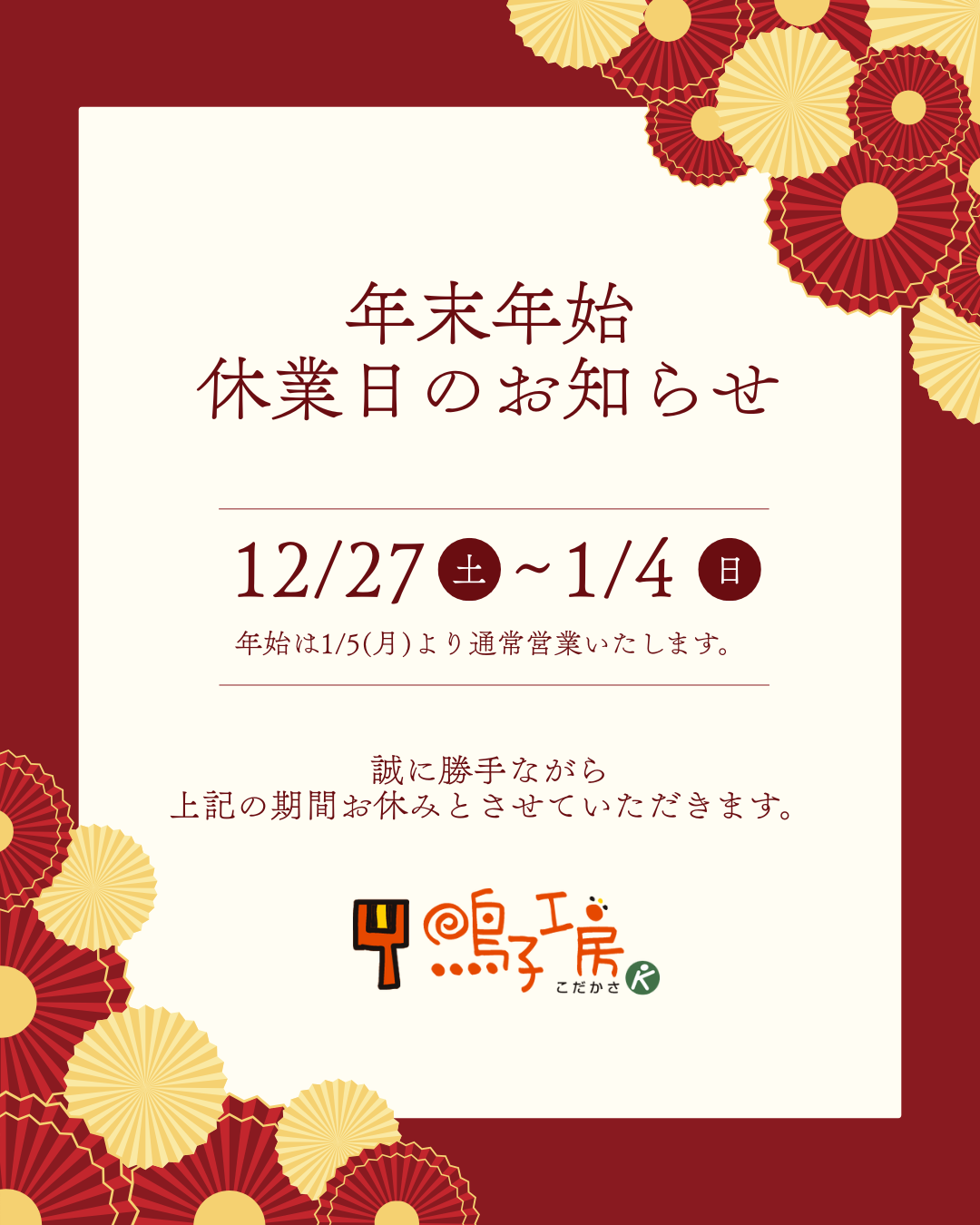 休業期間中にいただきましたご注文やお問い合わせにつきましては、1月5日(月)より順次対応させていただきます。